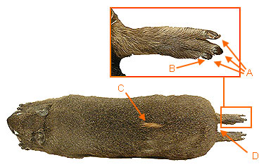 C. There is one (and only one) small patch of hair on the center of the back of the animal that is a different color than the surrounding hair.D. The tail is vestigial.