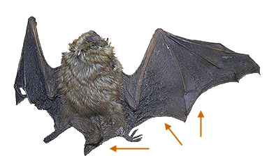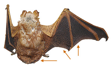 The coloration of the wings and uropatagium is without a distinctive pattern of orange and black with small black specks on an orange background.