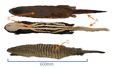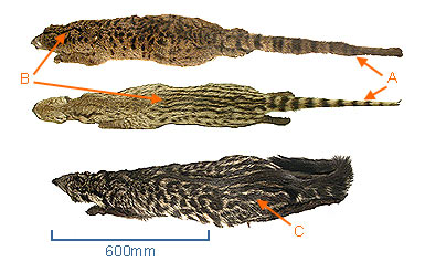 C. The body is spotted or with vertical stripes. If there are vertical stripes the length of the head and body is longer than 600 mm.