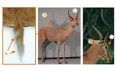 There are 2 species known in Tanzania: Gazella granti (Grant's Gazelle) and Gazella thomsonii (Thomson's Gazelle). In the picture to the right the animal on the left side is a Grant's gazelle (note that the white extends above the tail) and the animal on the right is a Thomson's gazelle (note that the white does not extend above the tail). The gazelles are common residents of grassland and woodland areas.