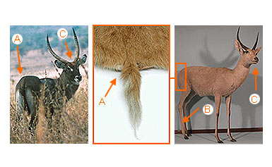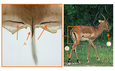 A. There is a series of three vertical black lines on the rump of the animal, with one on the tail and one on either side of the tail.