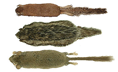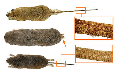 Either there is no tail, or there is a naked tail (or nearly so). While there may be hairs on the tail, including thick tufts on the tip, it is possible to see scales, or the form of the bony support on some aspect of the tail.,