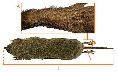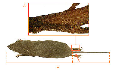 B. The tail is usually greater than 65% of the head and body length.If the tail is less than 65% of the head and body length, the tail is fatter near the base than it is in the distal region.